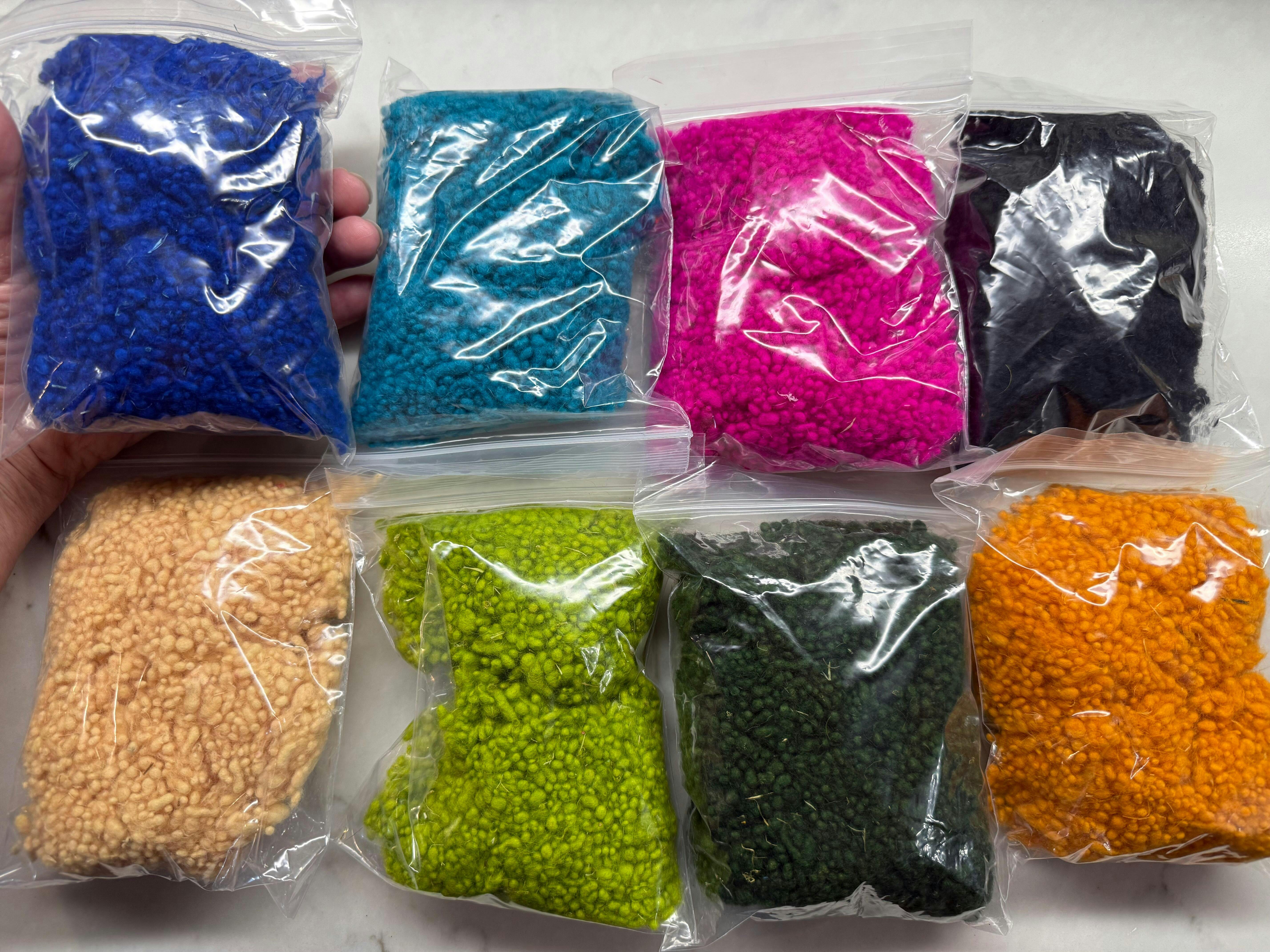 Wool Nepps are small bits of wool that are produced as a bi-product of wool processing. These nepps are hand dyed with a range of beautiful colors. Nepps can add great effect to hand spun yarn, nuno felting or needle felting projects.